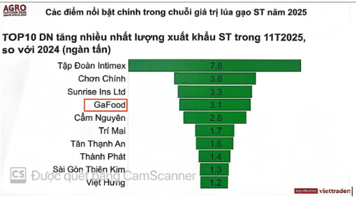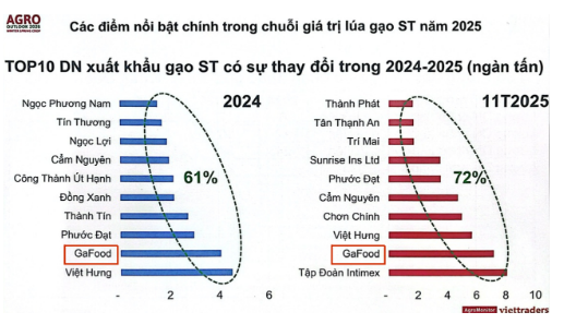 Đáng chú ý, số liệu phân tích tại hội thảo cho thấy GaFood xếp thứ 2 trong Top 10 doanh nghiệp xuất khẩu gạo ST có sự thay đổi lớn về cơ cấu và quy mô trong giai đoạn 2024 – 2025, phản ánh sự điều chỉnh chiến lược và năng lực thích ứng mạnh mẽ trước biến động thị trường. Đồng thời, GaFood đứng thứ 4 trong Top 10 doanh nghiệp tăng mạnh nhất về sản lượng xuất khẩu gạo ST trong 11 tháng năm 2025 so với năm 2024, khẳng định vị thế ngày càng rõ nét trong phân khúc gạo ST xuất khẩu.